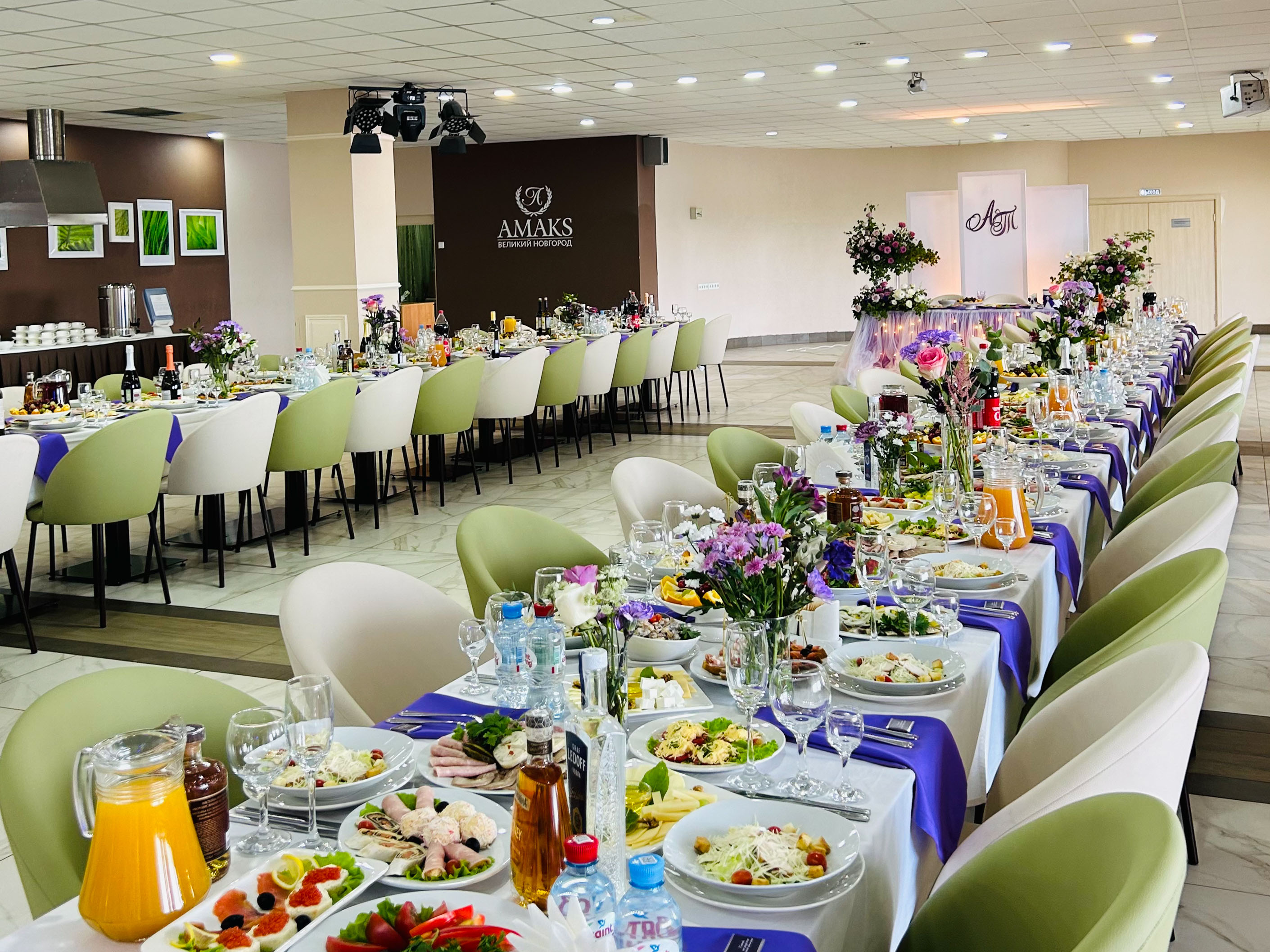 Мы предлагаем вам отпраздновать свадьбу, юбилей или любое другое торжество в элегантной и уютной атмосфере наших залов.